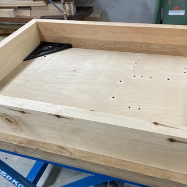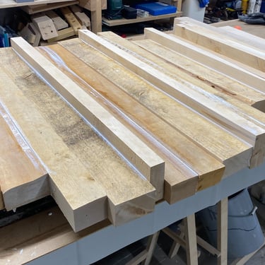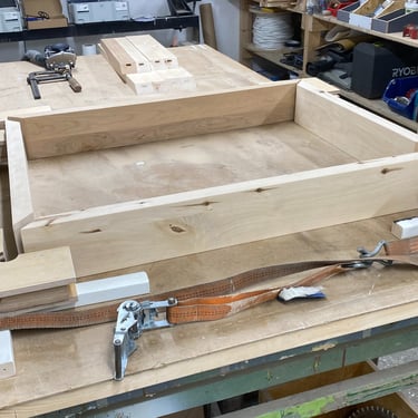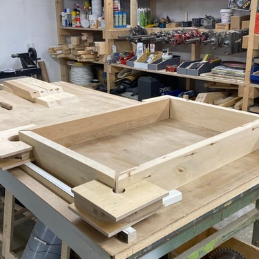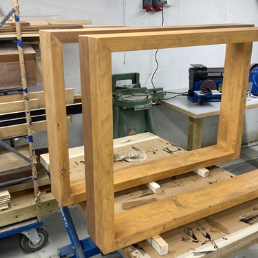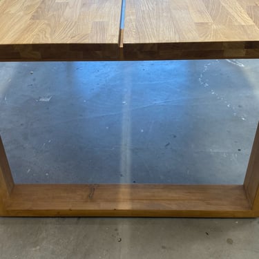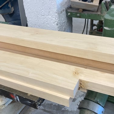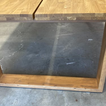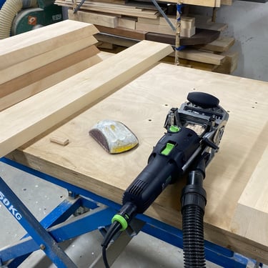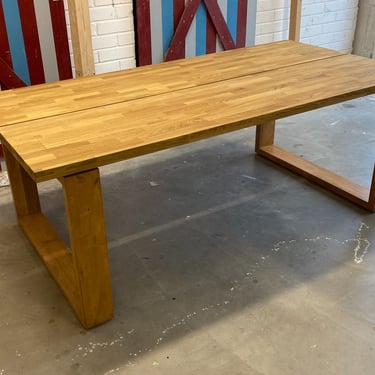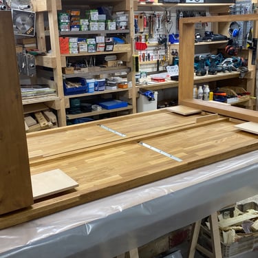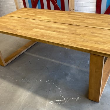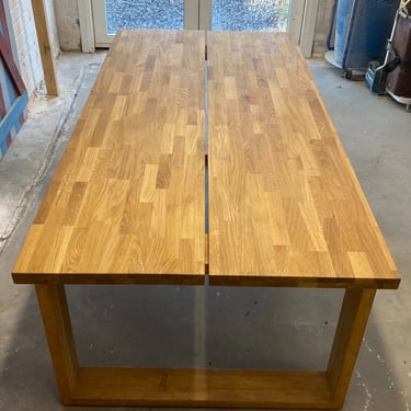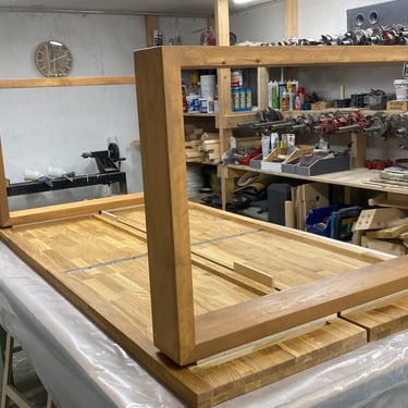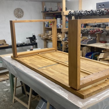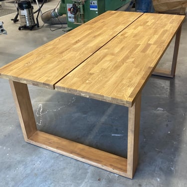 Kaksi tammista pöytälevyä halusi jalat alleen. Tein ne massiivikoivusta jiiridominoliitoksilla. Väritykseksi valitsin tammen kanssa sointuvan. Lattiaa vasten tuli tassut. Pöydän koko: 200 x 100 cm ja korkeus n. 74 cm (säädettävä).